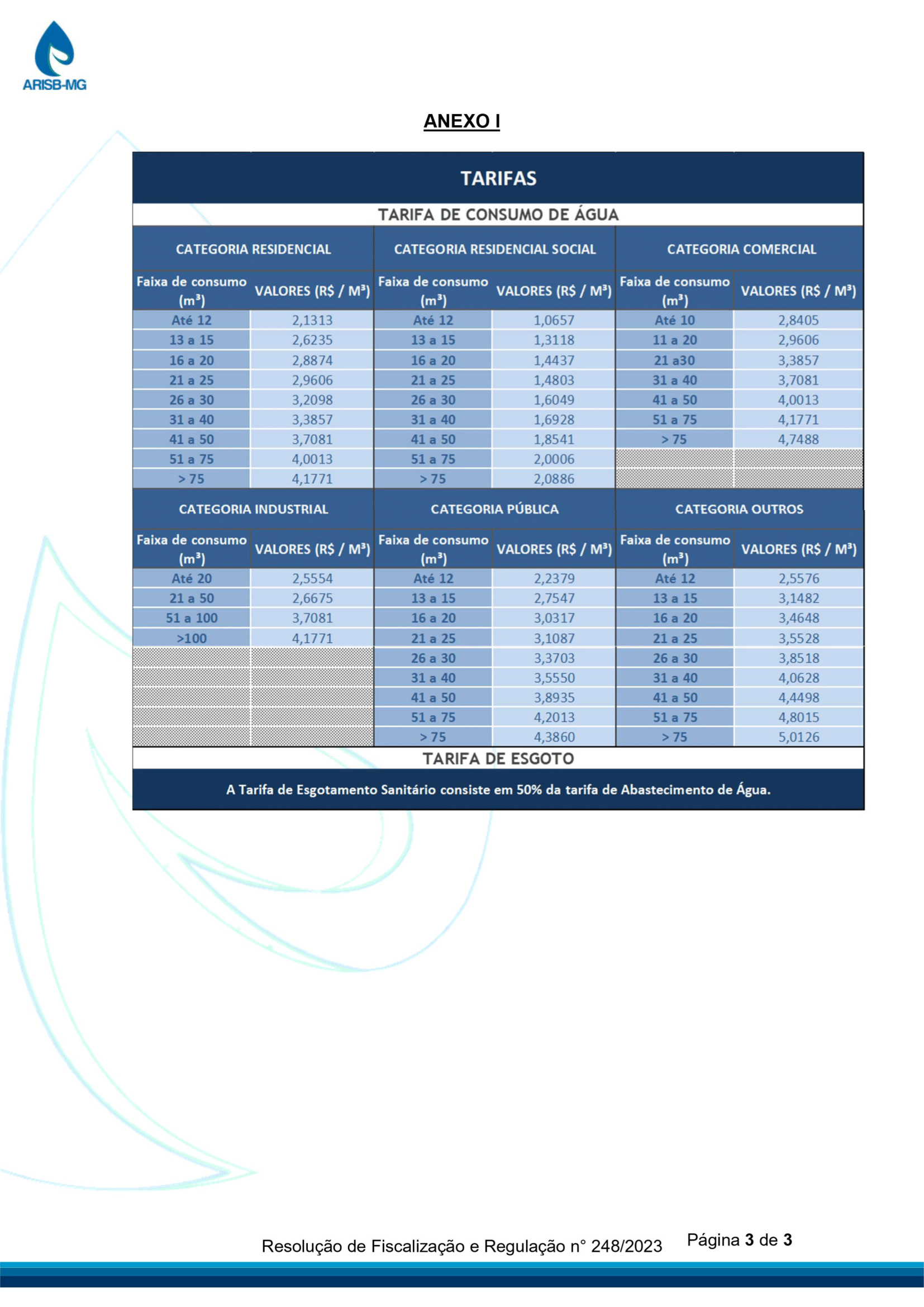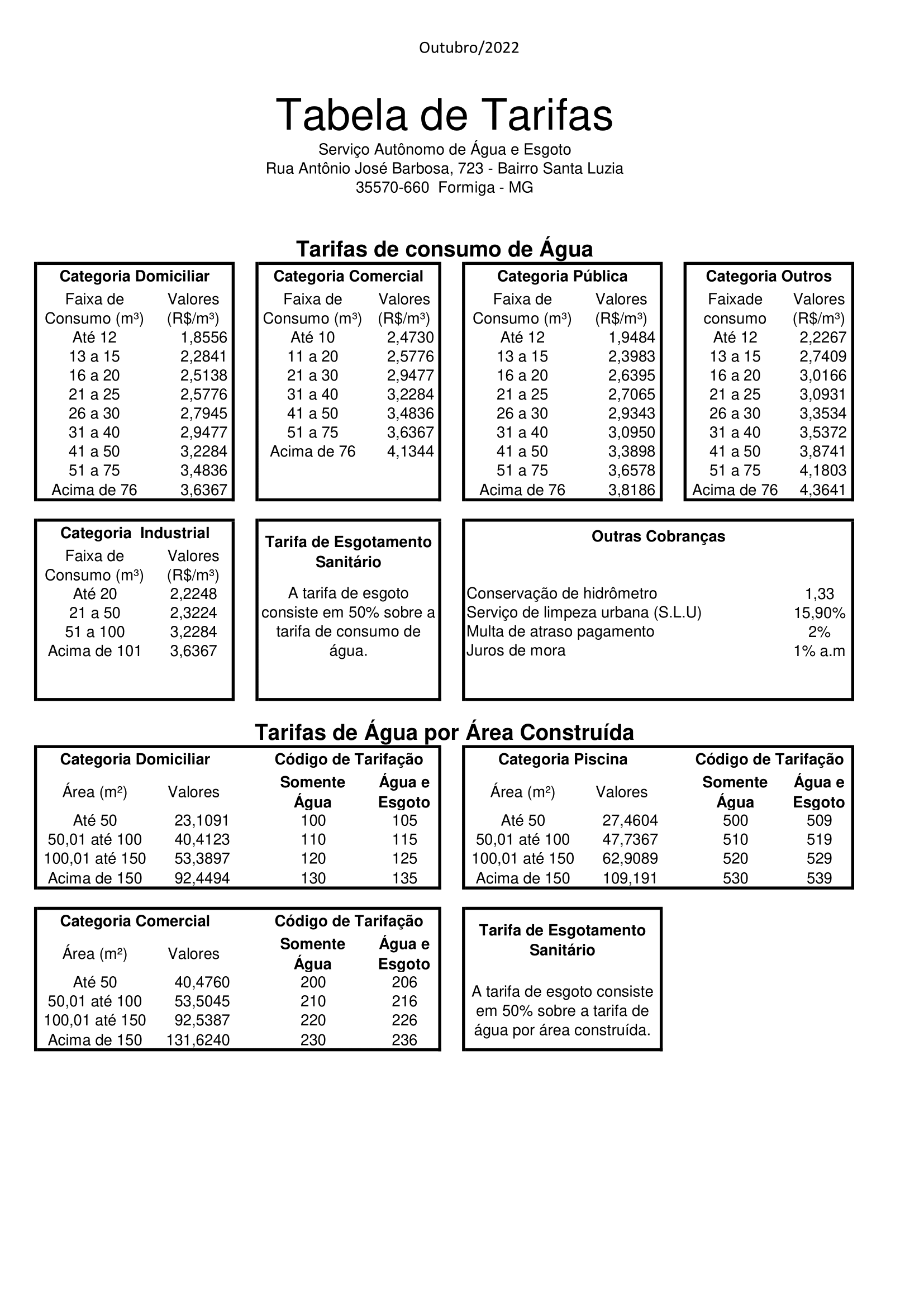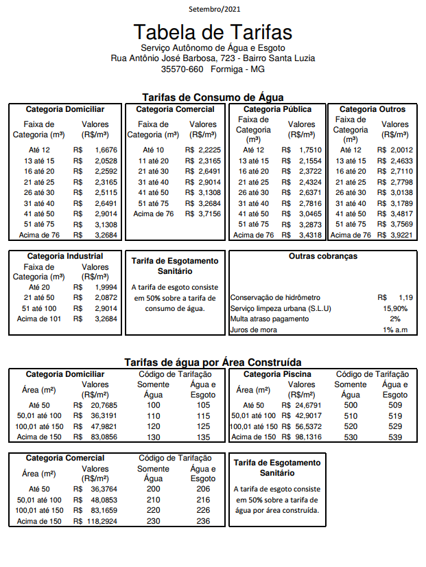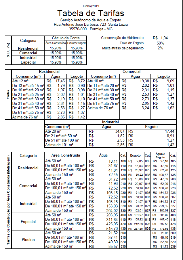 Tabela de tarifas de Água e Esgoto, de acordo com a